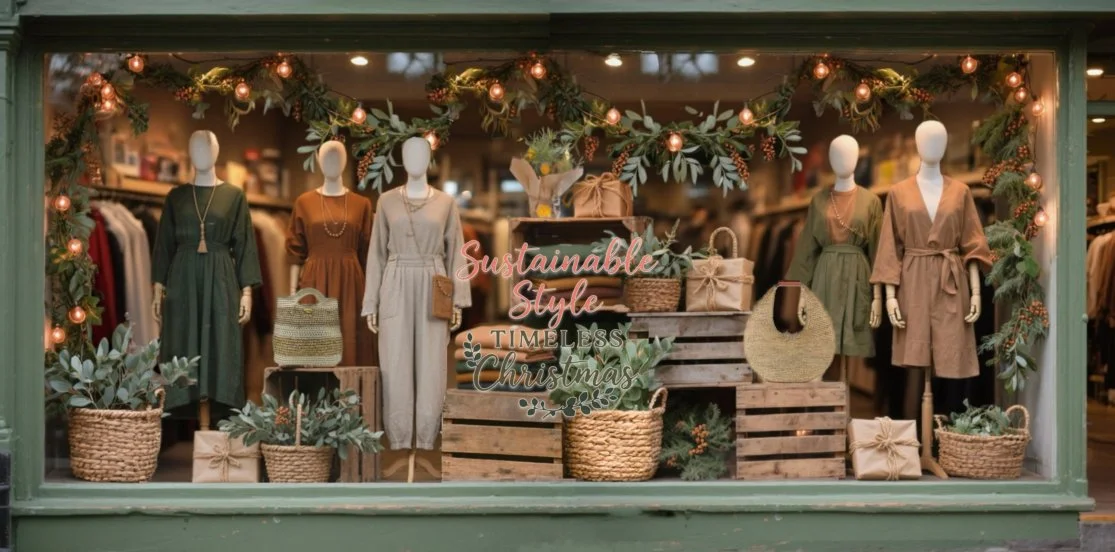 Australian Christmas window display with mannequins in earthy-toned outfits surrounded by timber crates, woven baskets, native greenery, and warm festive lights. A decal on the glass reads “Sustainable Style, Timeless Christmas,” highlighting an eco-friendly holiday theme.